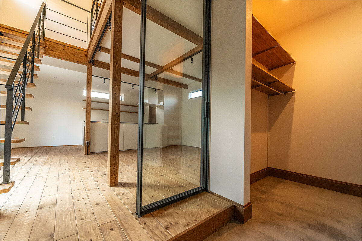 玄関には透明なガラス製の建具をビルトインしたことによりいつもとは違う雰囲気に。