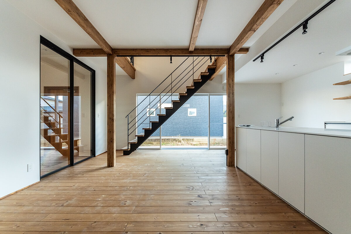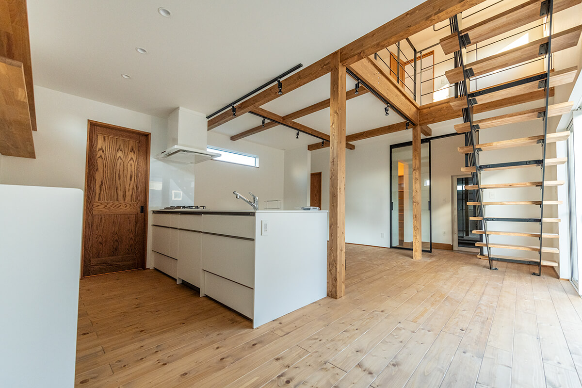 閑静な住宅街に建つ白い塗り壁が際立つ外観デザインと、お客様のご意向によるカスタマイズが施された室内も見どころです。