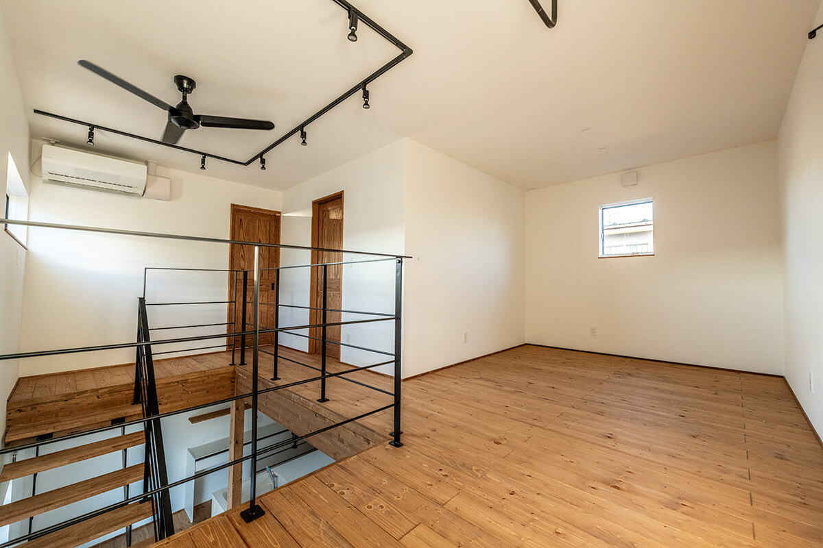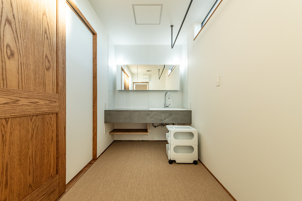 2階の間取りは実用性のみならず、洗面室の床をアジアンテイストに仕上げ、洗面カウンターは質感の高いモールテックスという素材で仕上げ、いつものBROOKとは一味違うデザインながら調和の取れた空間になりました。