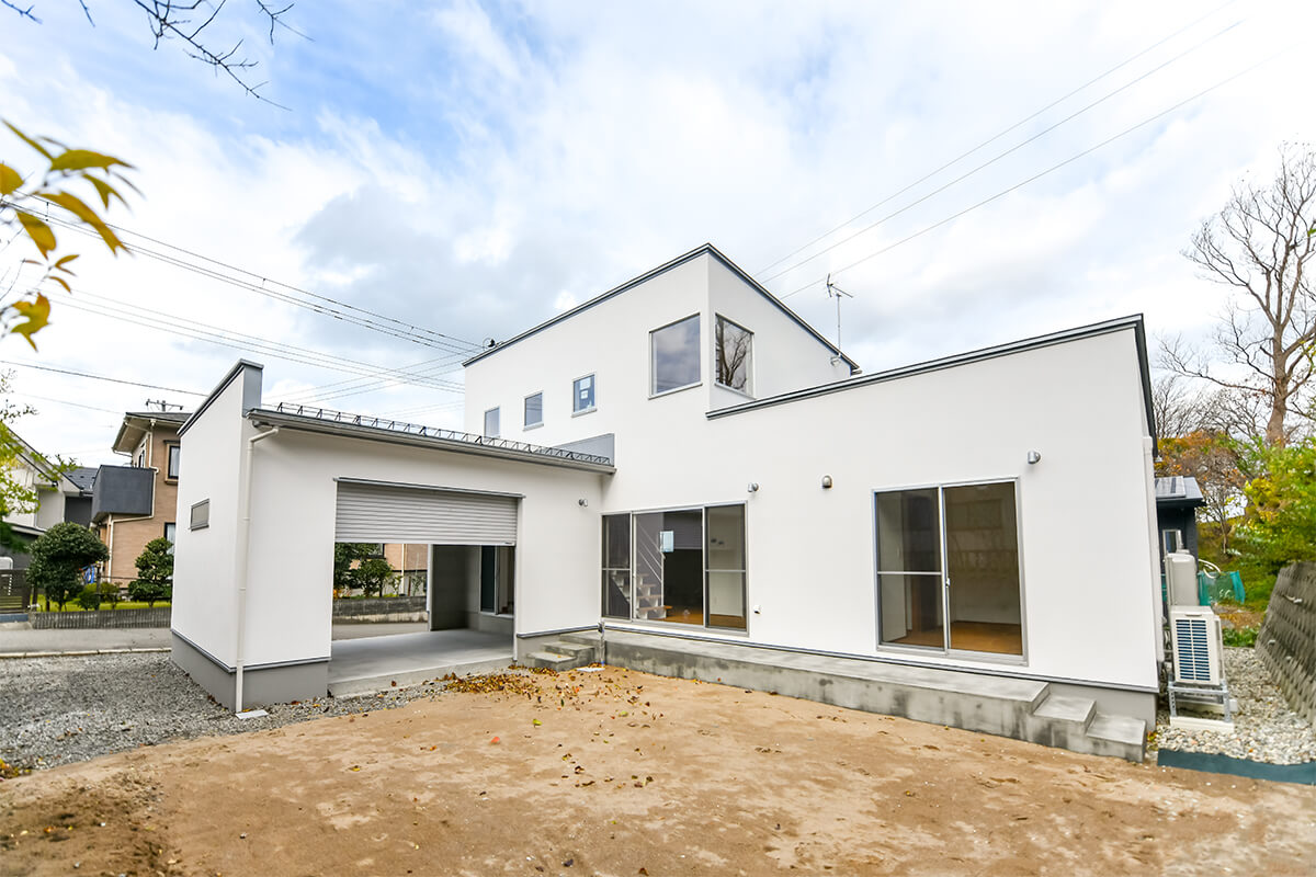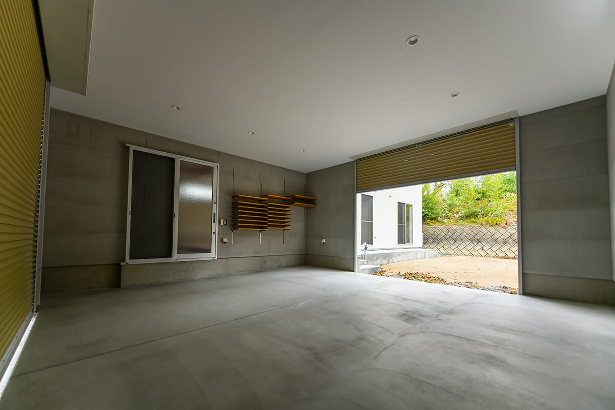 全体を白の塗壁で仕上げ、ガレージは前後にシャッターのあるプランになります。