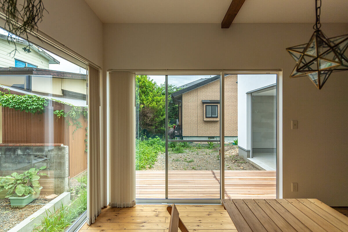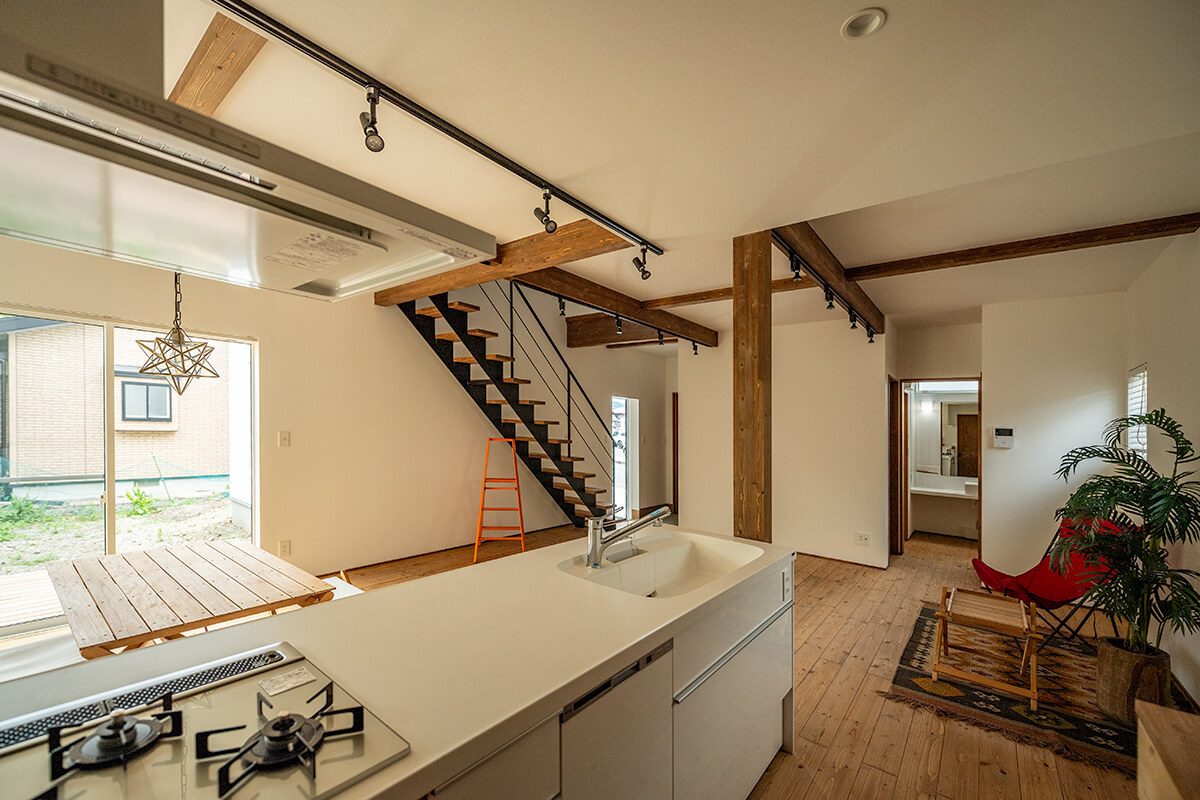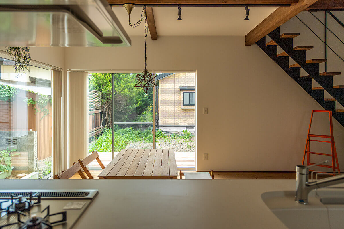 キッチンに建つと正面にはリビング越しに庭に面した大きな窓があり、開放感あふれる気持ちの良いキッチンエリアになります。