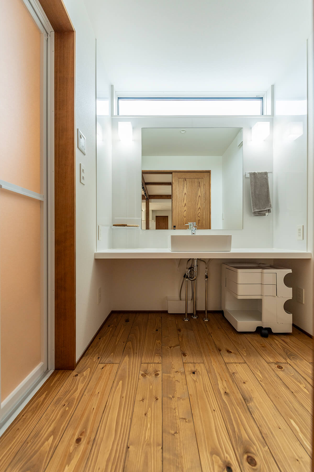 1階のバスルームに洗濯機を設置せずあえて2階に配置することで洗濯から収納までの流れをスムーズにしつつ、1階のバスルームはスッキリとした空間にさせることもできました。