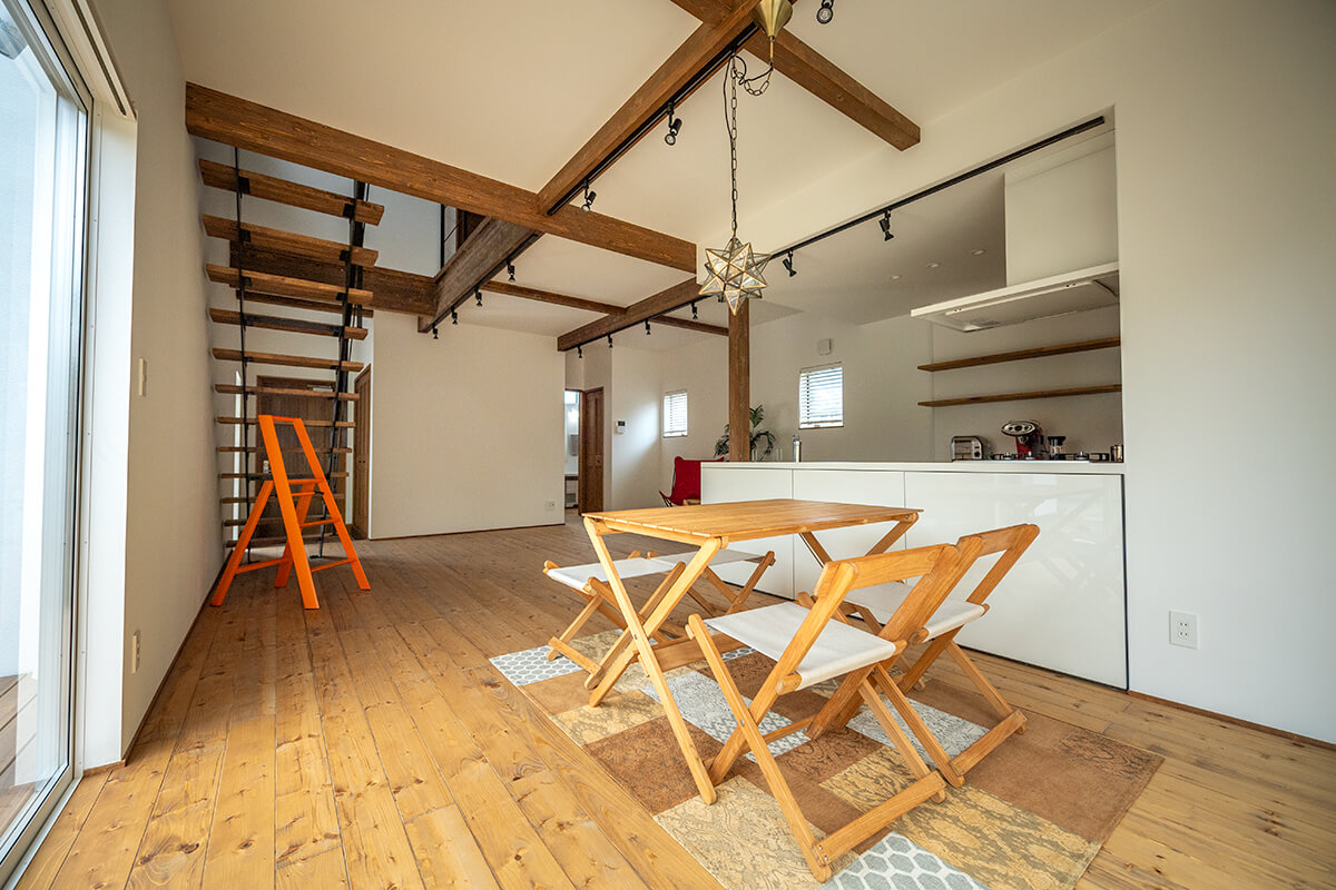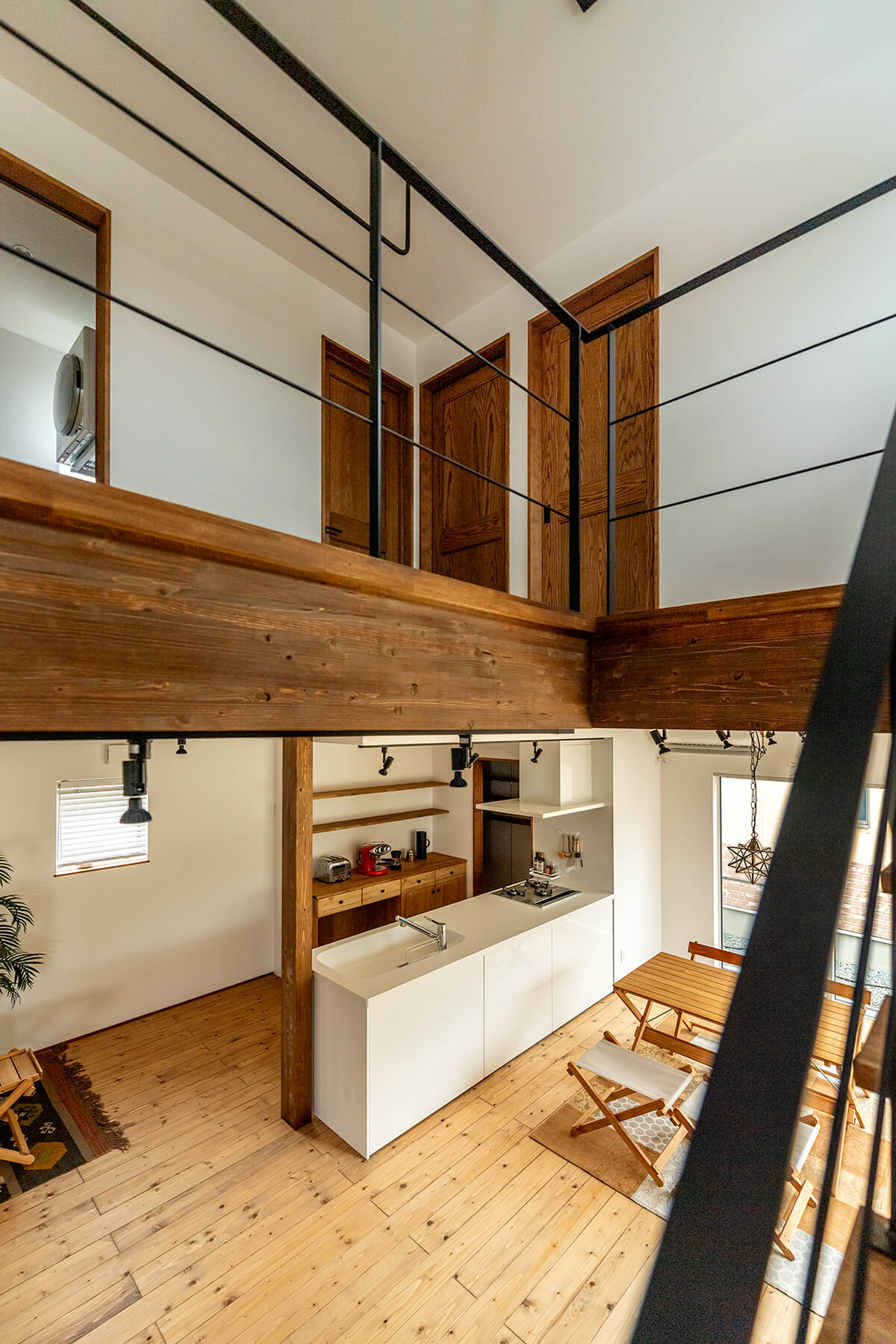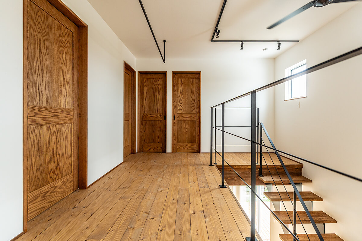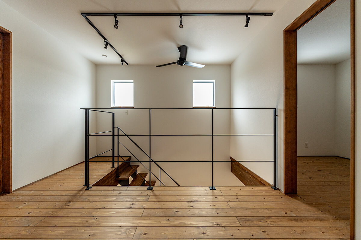 大きな吹き抜けにかかる鉄骨階段を上ると実用性の高いフロアが現れます。