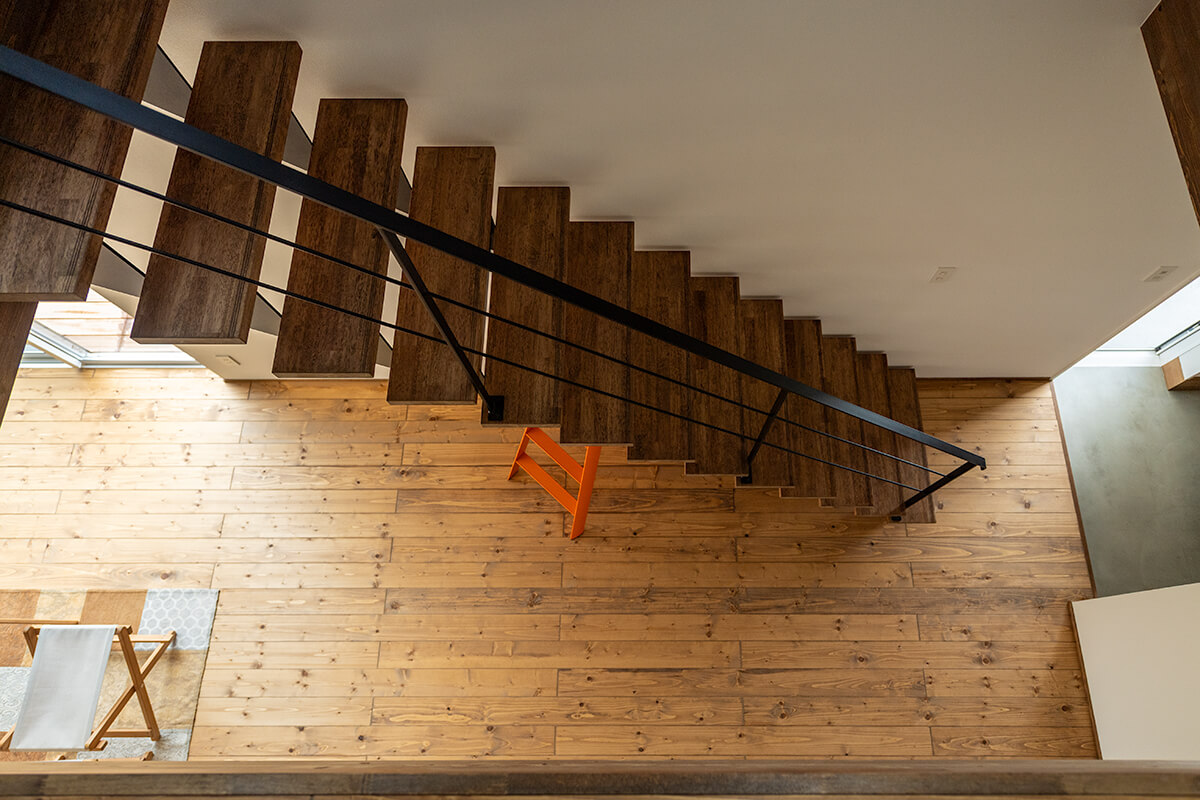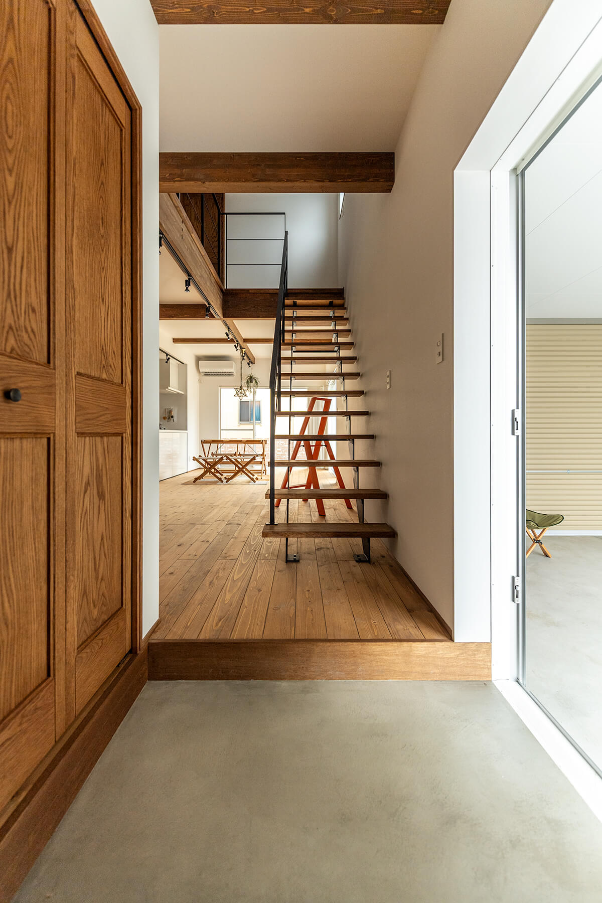 玄関から縦方向に向かって伸びるオリジナルデザインの鉄骨階段も開放感の演出に一役買っています。