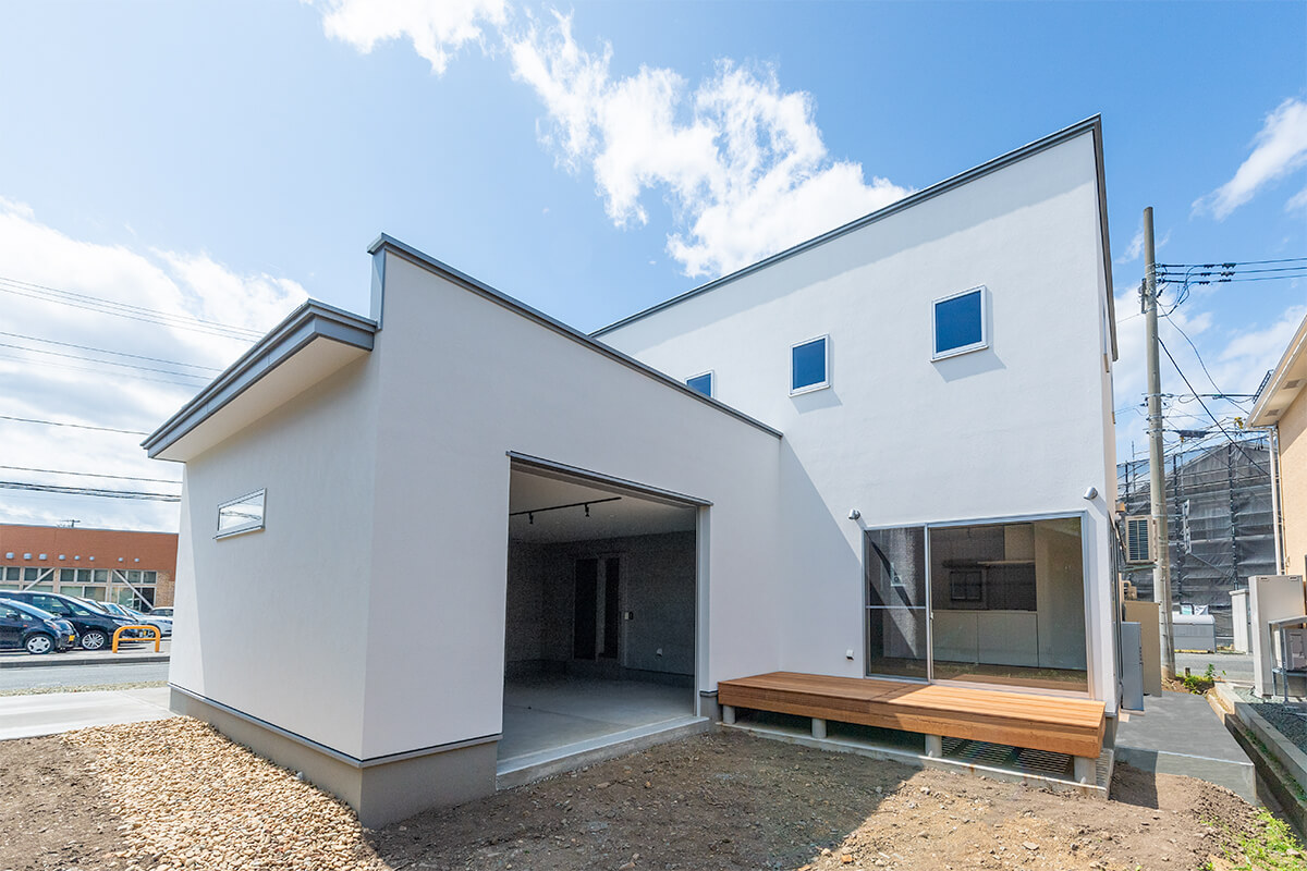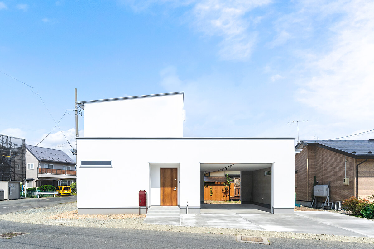 交通量の多い道路と西面であることから西日を遮るため、窓は最小限にし、大きな白い塗り壁とガレージが住空間を隔てるように配置してあります。