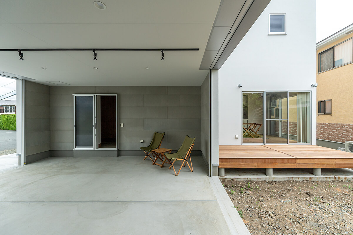このデザインにすることで、ガレージ奥の庭とそこに面したリビング窓に対してプライバシーが守られる設計です。