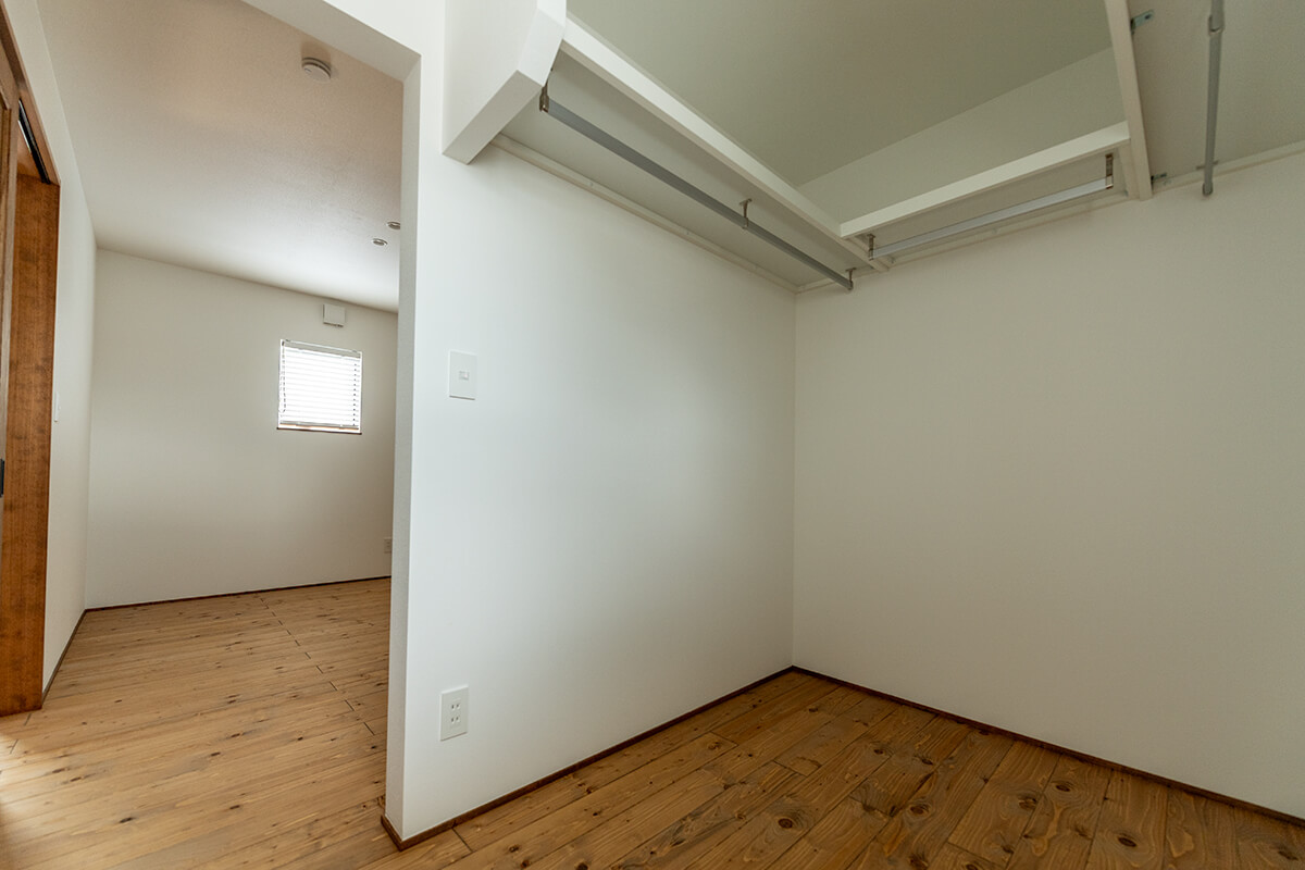 大きめのファミリークローゼットの中に洗濯機と乾燥機を設置し、洗濯から収納までを一つの空間でこなせるように設計させていただきました。