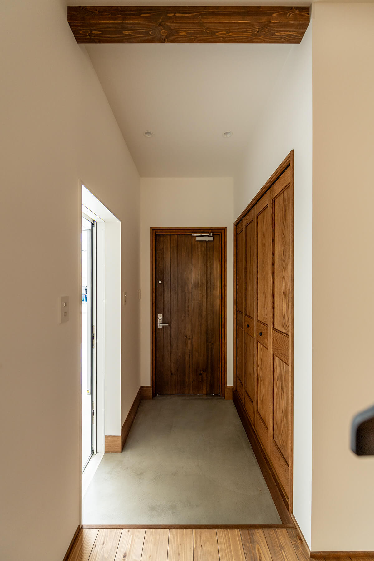 通常の正面玄関はお客様や徒歩でのお買い物の際に活躍してくれる木製の断熱ドアです。
