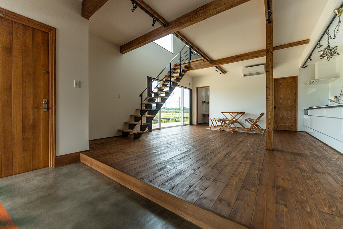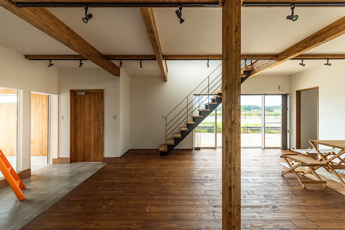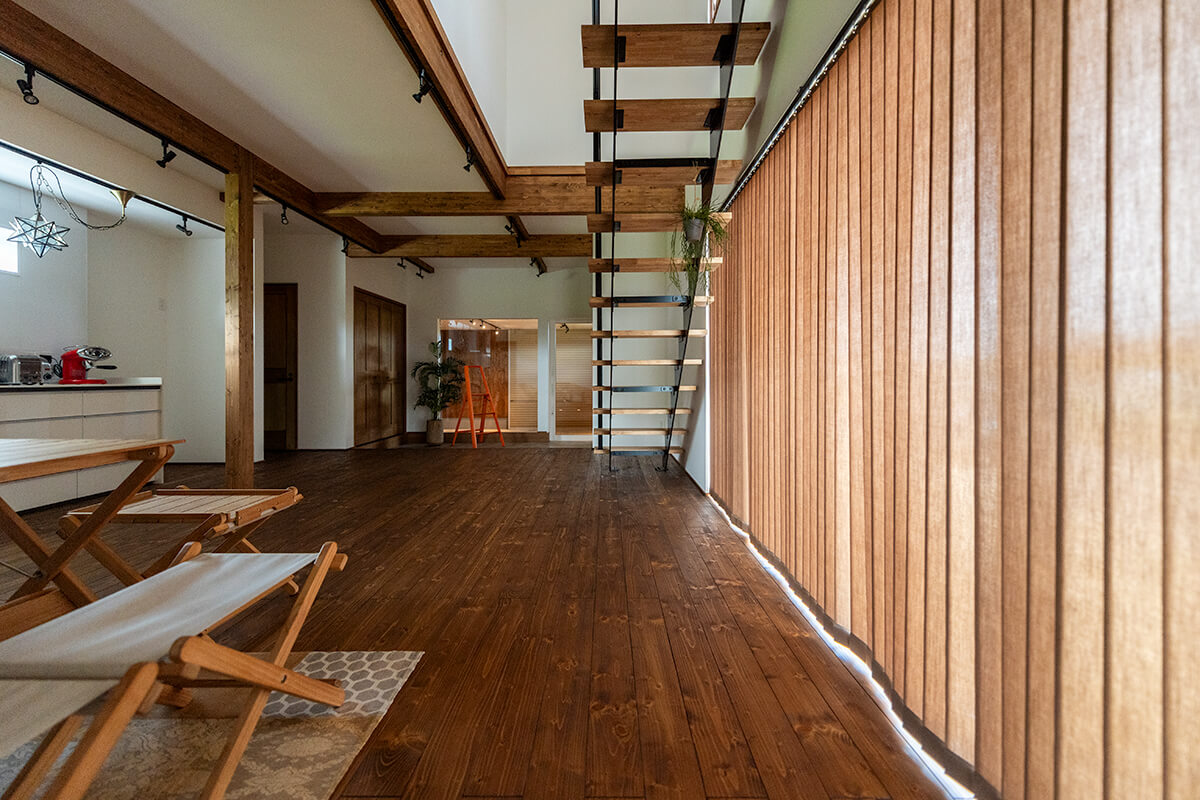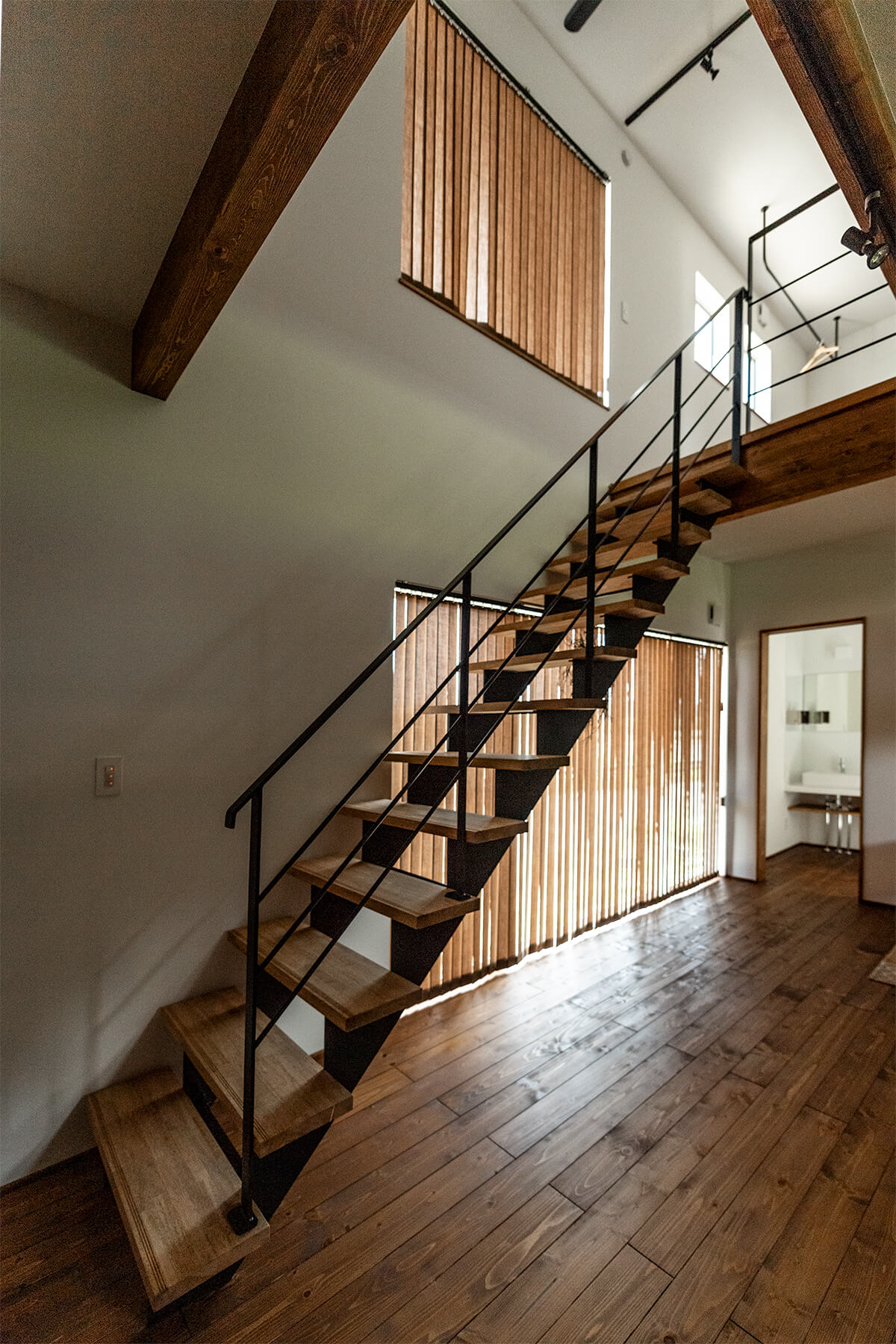 玄関からリビングを眺めても視界を遮るものはありません。 斜め上に向かって伸びるスケルトンデザインの鉄骨階段とリビングから見える吹き抜けも縦方向の開放感の演出には大切な要素です。