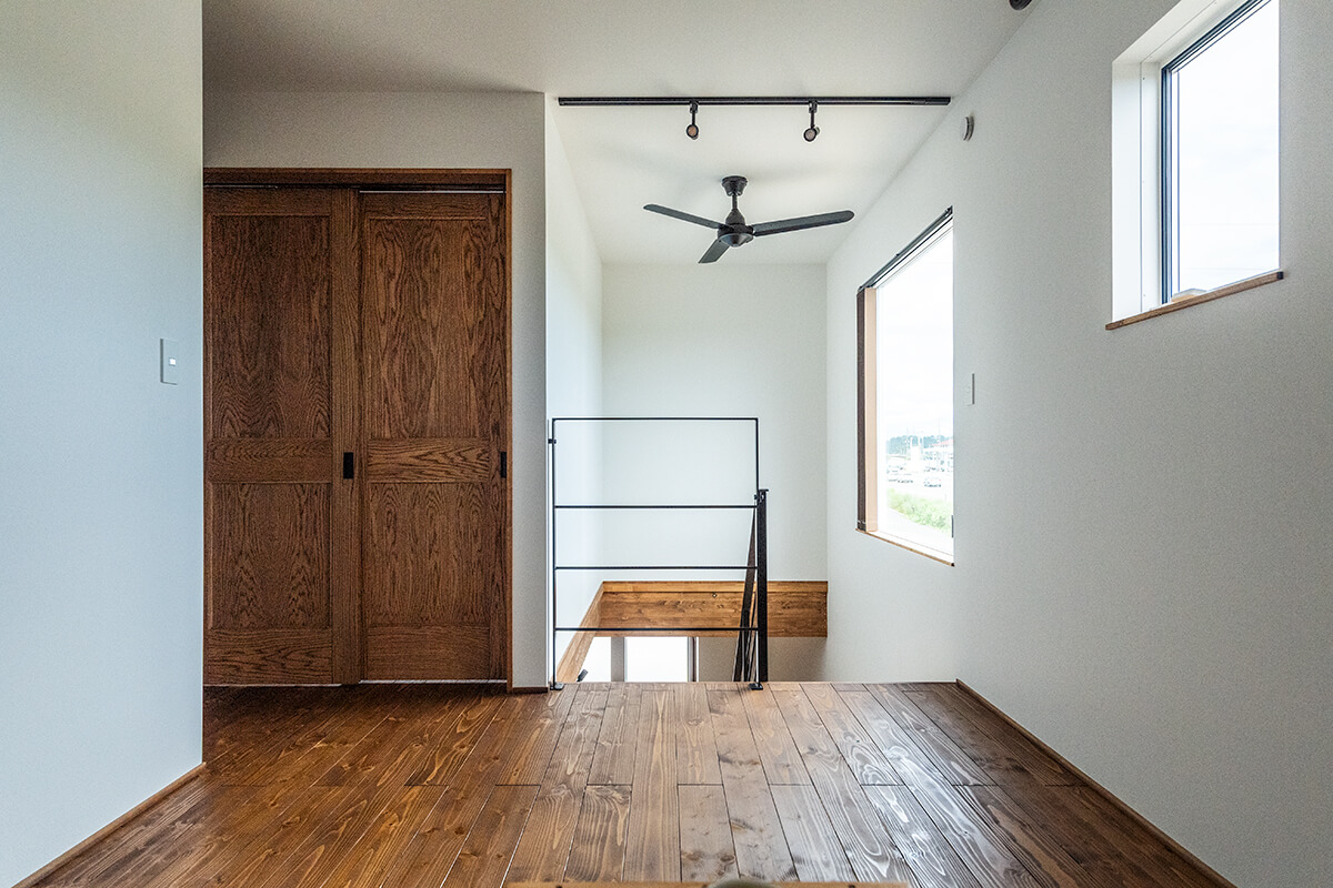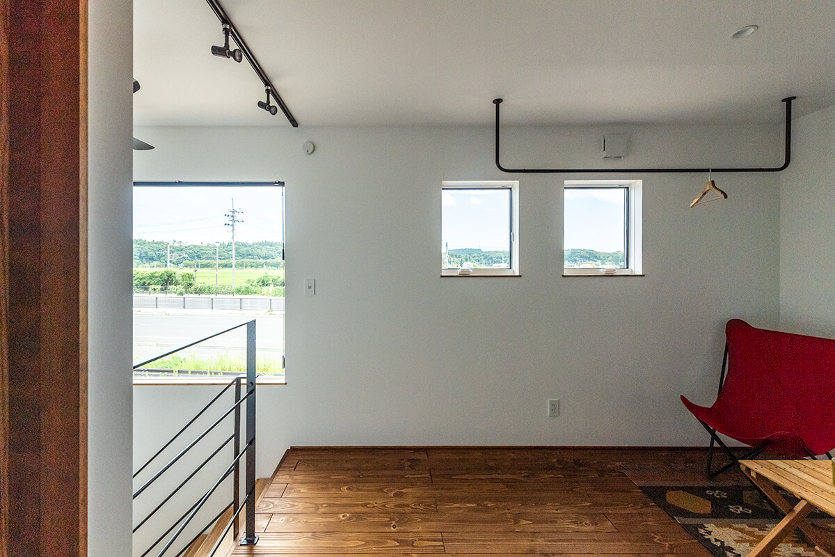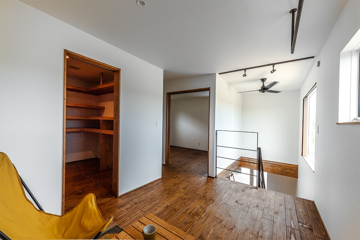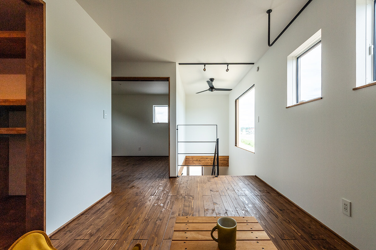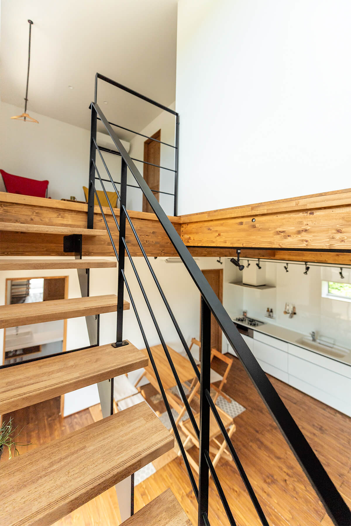 小さいながらも吹き抜けをしっかりと作り、吹き抜け越しに伸びるオリジナル階段を登ると、ちょっとしたホールもあり、窮屈さを感じない間取りです。