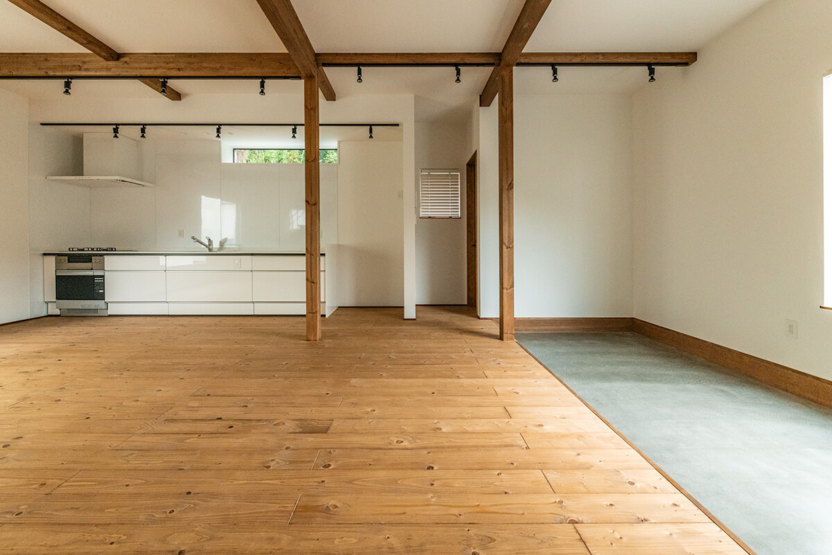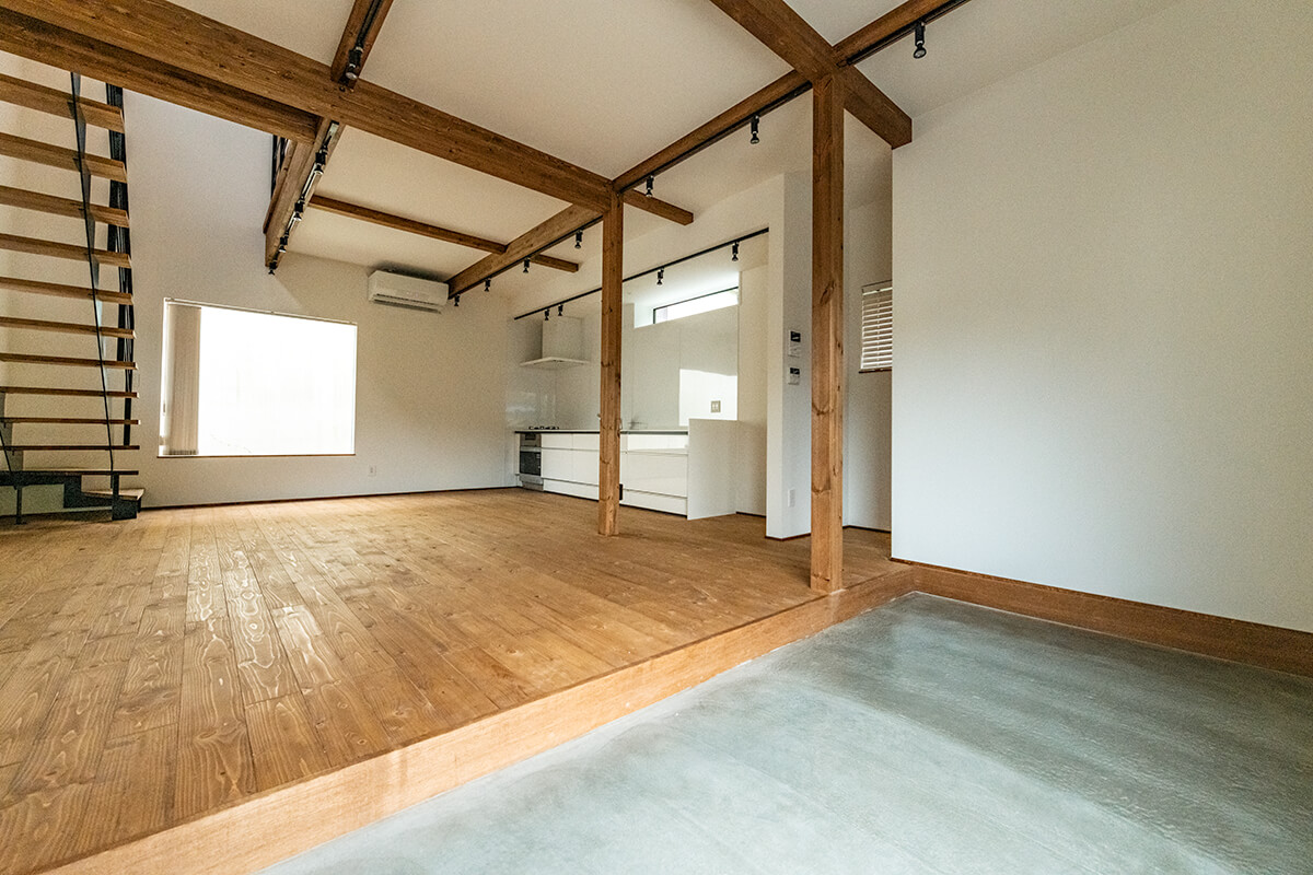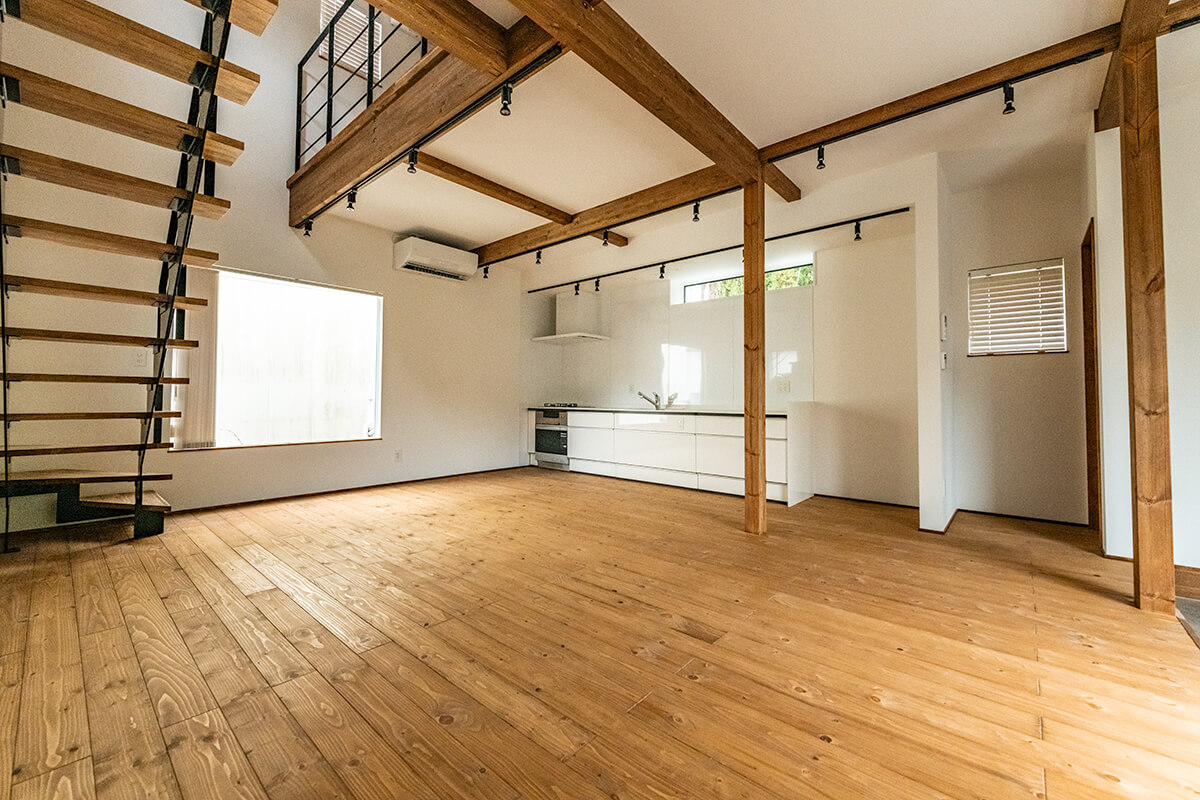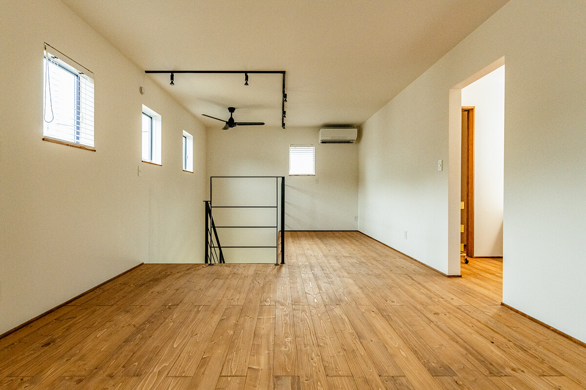 このサイズ感の建物ながら、吹抜けをあえて作り、1階と2階の繋がりも保つような設計にさせていただきました。