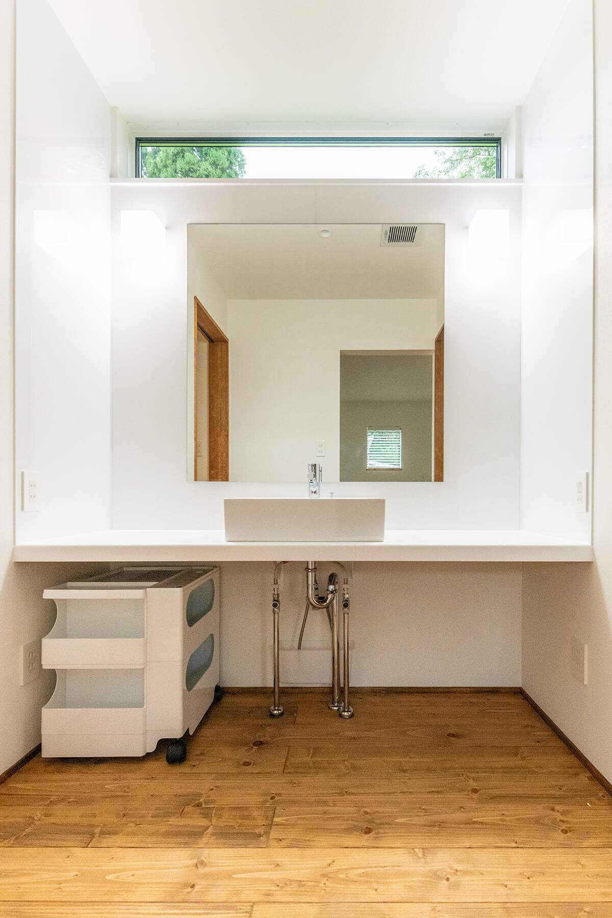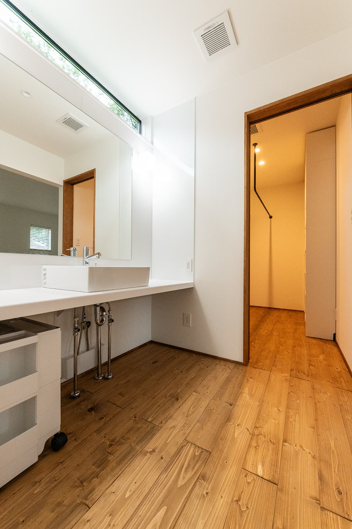 正面の洗面台の上にはスリット窓があり、光を入れる効果とデザインのアクセントにも一役買っています。