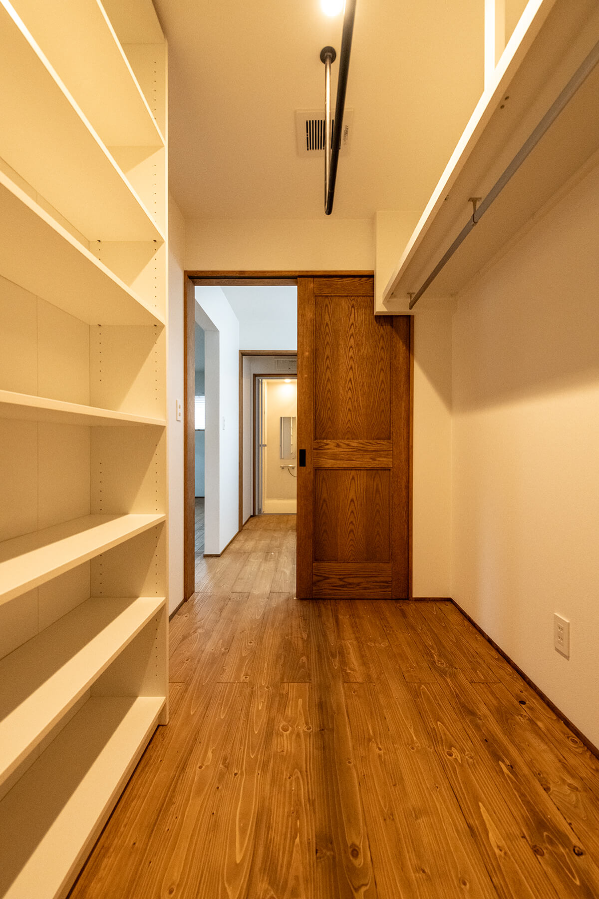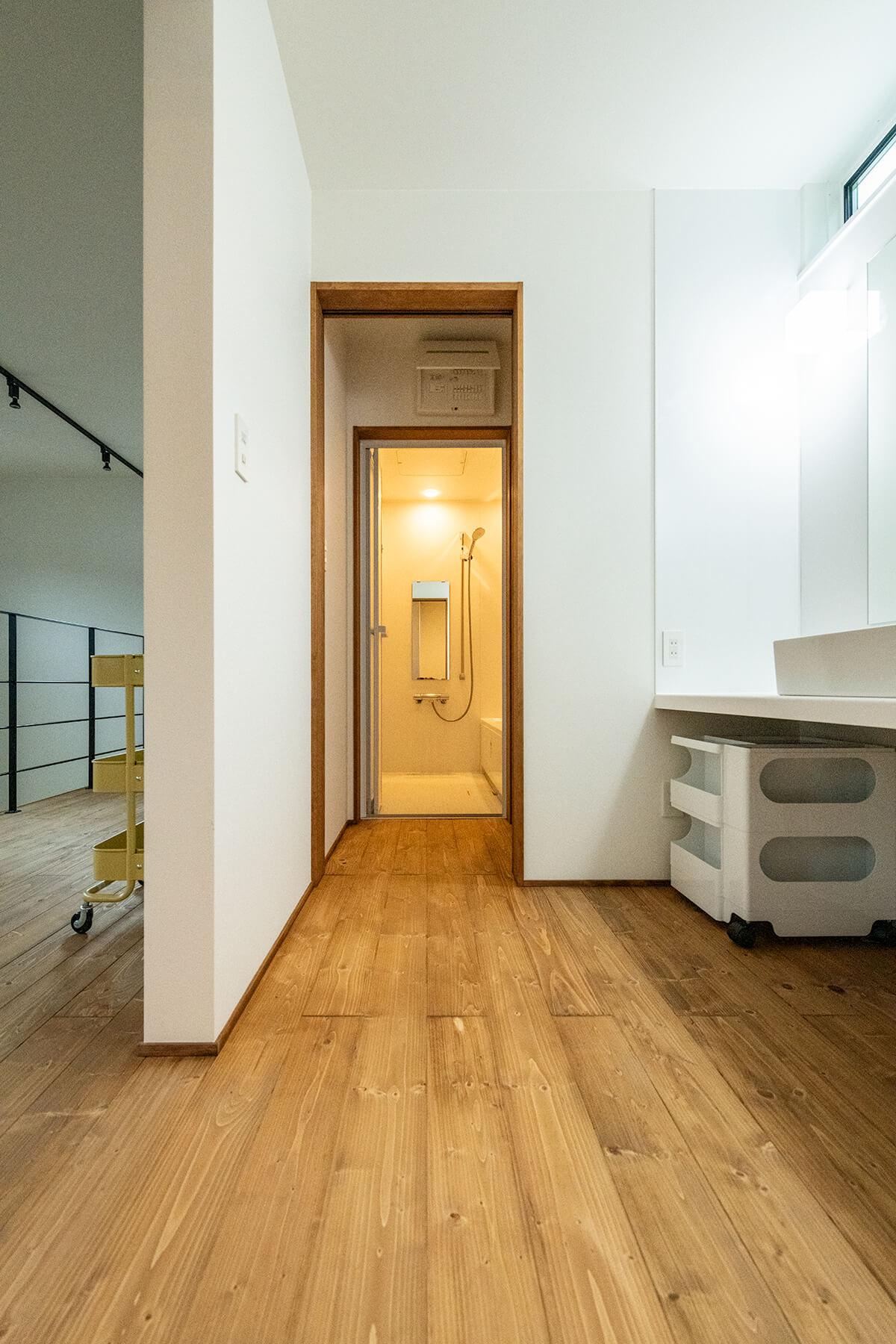2階はワンフロアにバスルームと間仕切にも使えるシェルフをレイアウトして収納エリアとしています。
